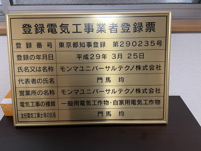 | 〇 2017年4月 | 東京都登録電気工事業として登録 東京都知事 第290235号 |